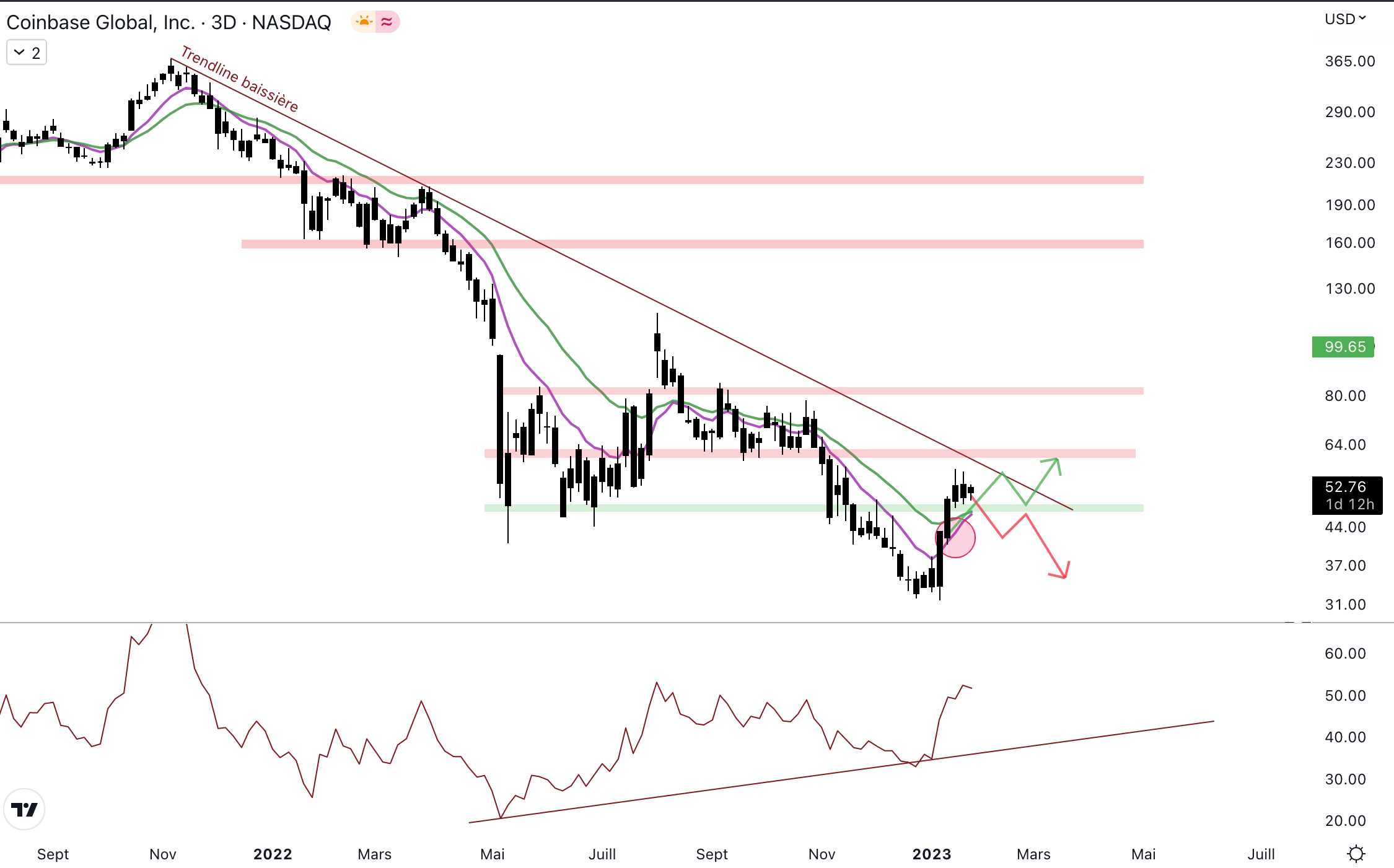 Le cours de Coinbase évolue au-dessus du support à 48 dollars. La trendline baissière est proche du cours. Il faudra la casser pour retrouver des couleurs sur cet actif. Deux scénarios peuvent alors être énoncés :
