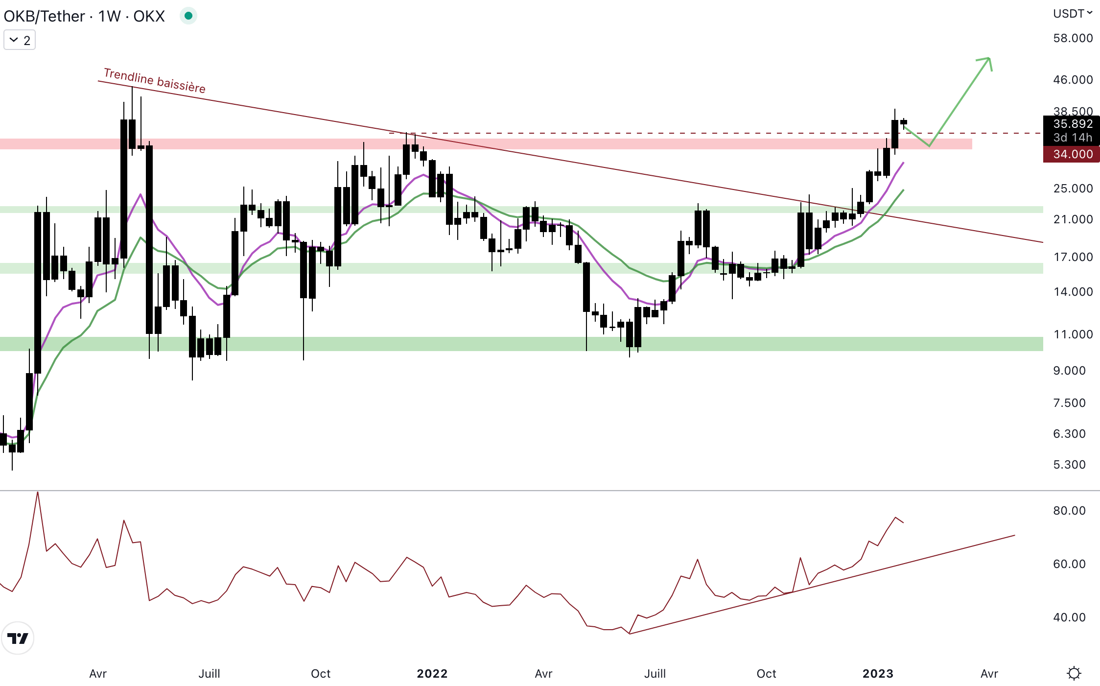 Le cours d’OKB est haussier en hebdomadaire. De plus, la clôture de la fin de semaine dernière a permis à OKB de marquer un « W » hebdomadaire. En effet, une clôture au-dessus de 34 dollars permettait de changer de dynamique. Ce genre de structure est très solide. Cela pourrait amener de la volatilité haussière dans les semaines ou mois à venir. Le biais institutionnel (EMA 9/EMA 18) est haussier. Le cours pourrait rebondir au niveau de ces moyennes mobiles en cas de chute.