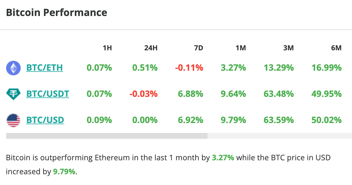 Performances du Bitcoin face à différentes paires. Source : Coincheckup