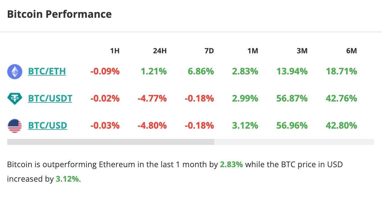 Performances du Bitcoin face à différentes paires. Source : Coincheckup
