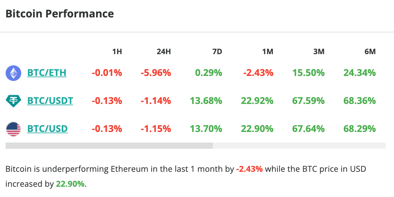 Performances du Bitcoin face à différentes paires. Source : Coincheckup