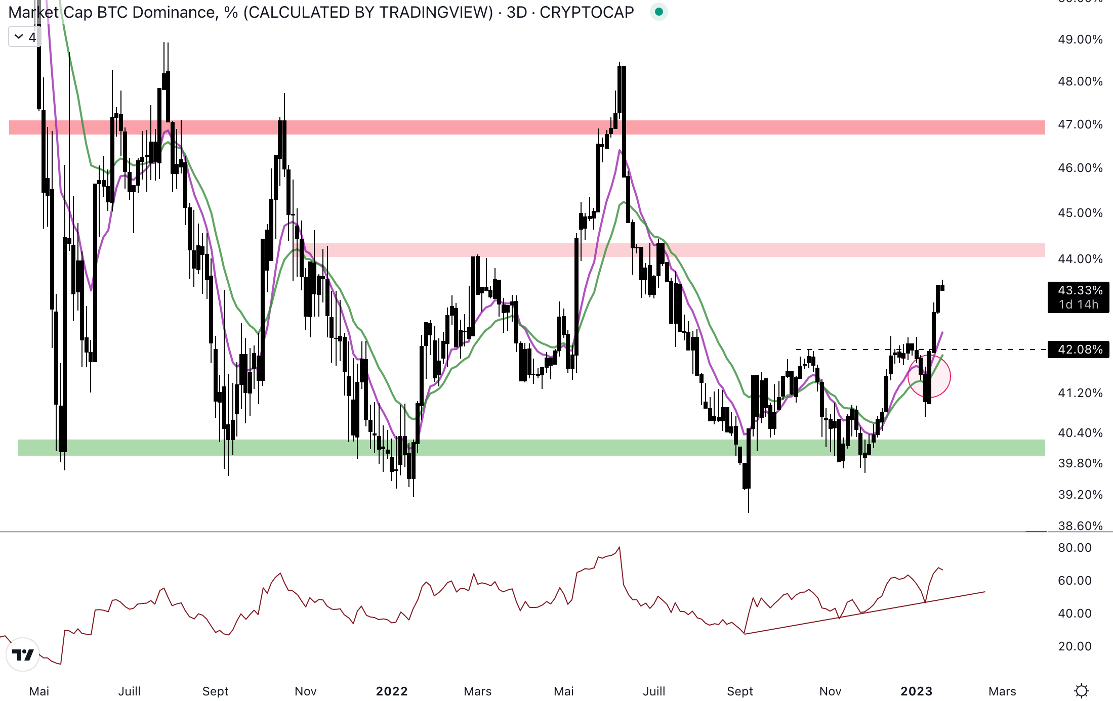 Le cours a rebondi au niveau du biais institutionnel (EMA 9/EMA 18). La dominance du Bitcoin est en hausse, le roi des cryptomonnaies attire les capitaux. Dans cet article, on expliquait pourquoi les altcoins pourraient souffrir en cas de hausse de la dominance du Bitcoin. Si le cours du Bitcoin monte, les altcoins grimperont également, mais ils seront moins performants que le Bitcoin. Si le cours du Bitcoin chute, les altcoins pourraient chuter plus fortement. Au vu de la dynamique sur la Bitcoin dominance, le cours se dirige vers la résistance à 44 %.