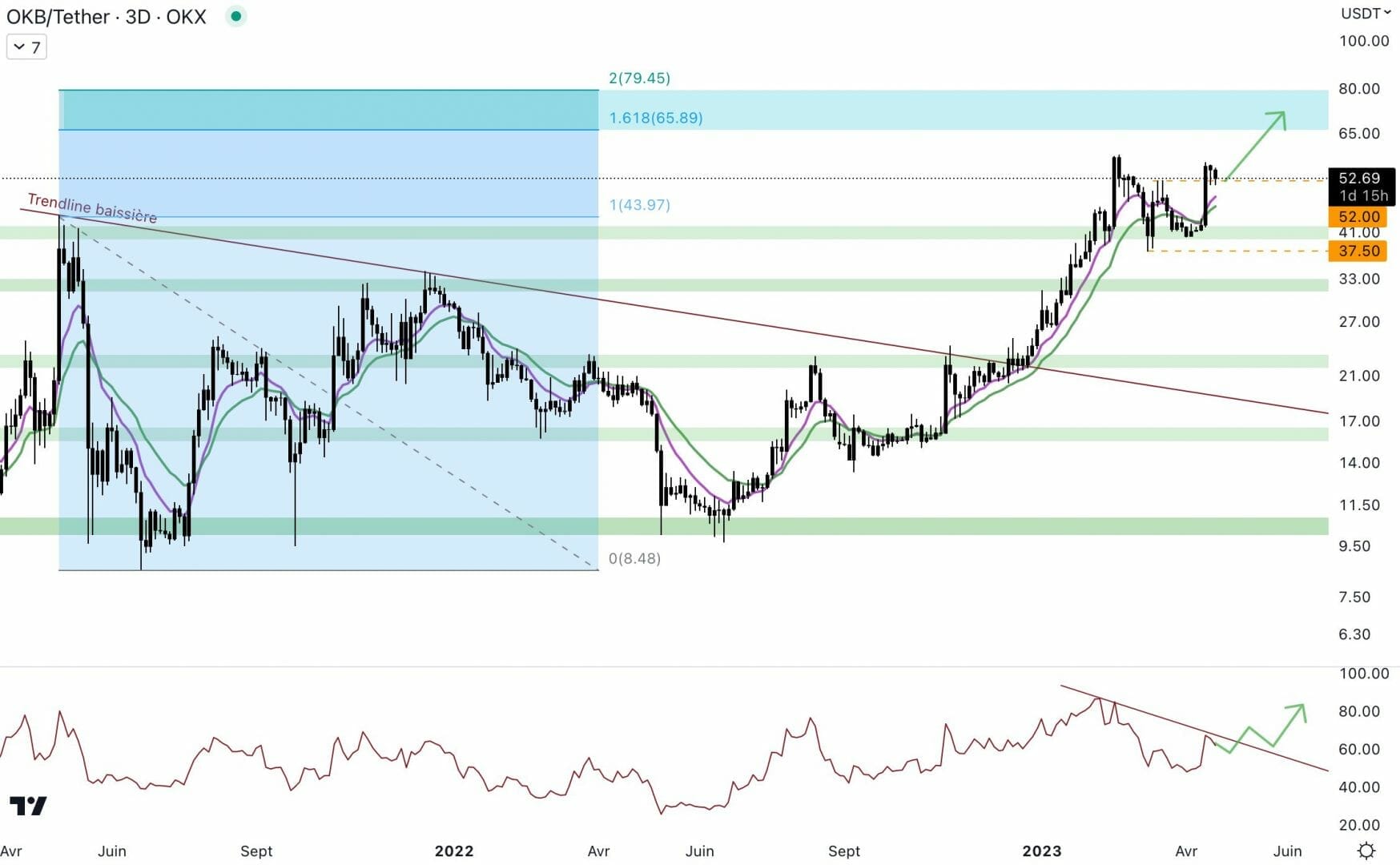 Le cours de l’OKB marque un double bottom au niveau du support à 41 dollars. Désormais, les acheteurs ont la main sur cet actif, et le cours pourrait rejoindre la zone d’extension 1.618 et 2 de Fibonacci située entre 66 et 80 dollars. Le biais institutionnel est haussier. Il pourrait agir en tant que support dynamique en cas de retracement.