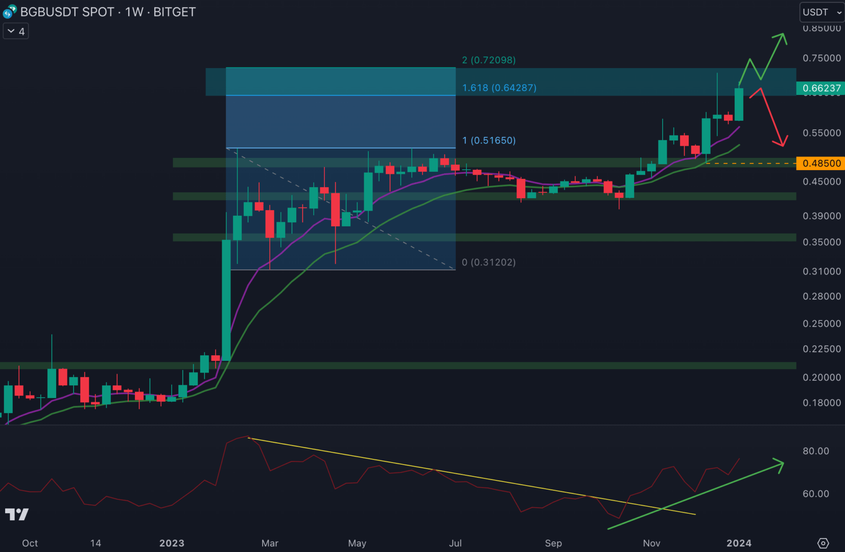 En plus d’avoir réussi à marquer un nouveau plus haut historique, le BGB est de retour au niveau des extensions 1.618 et 2 de Fibonacci. En effet, le cours a une première fois bloqué dans la zone située entre les 0,64 $ et les 0,72 $, et un nouveau rejet pourrait intervenir dans les jours à venir. Toutefois, si cette zone est cassée, le cours pourrait continuer d’exploser à la hausse. En cas de chute, le cours devra réagir au niveau du support à 0,49 $ et au niveau des moyennes mobiles 9 et 18. En effet, les acheteurs devront alors défendre le dernier creux marqué à 0,485 $. Le BGB a clôturé l’année 2023 en affichant une hausse de 230 %, l’année 2024 sera-t-elle encore meilleure ?